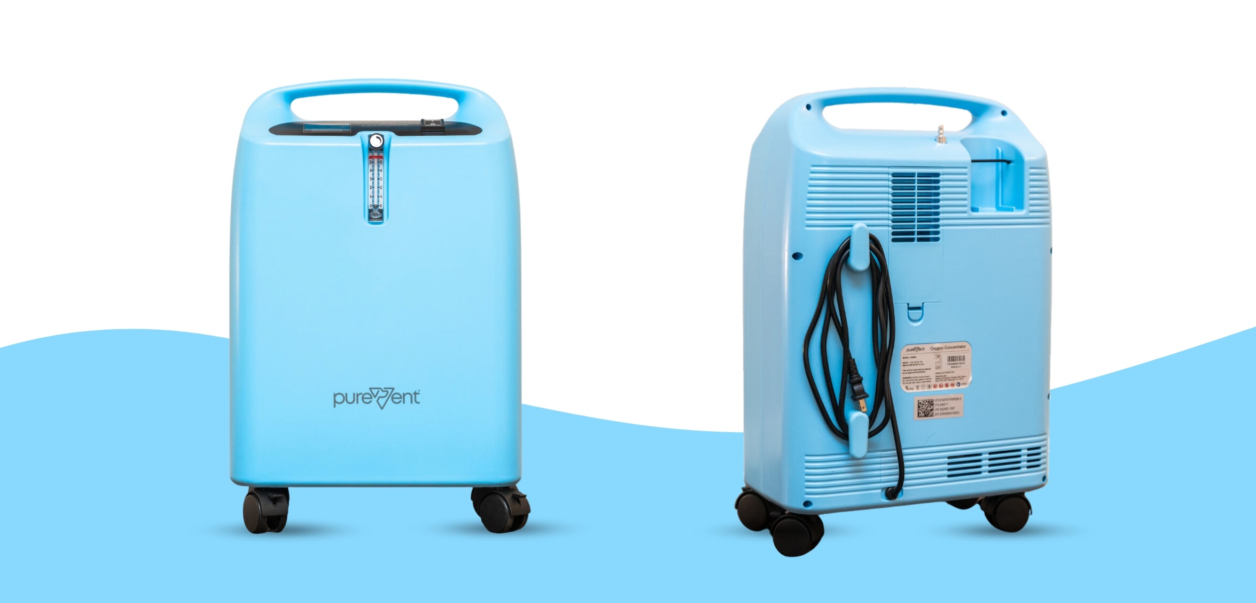 The PureVent 5L Oxygen Concentrator plugs into a wall outlet (120V) and concentrates oxygen from room air, providing high purity oxygen gas (>90%).
